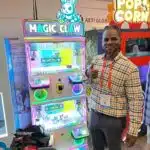 - Elliott Campbell introduces the Magic Claw Mini machine at the AETI Global Ltd. exhibit.