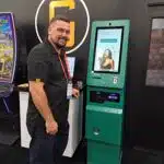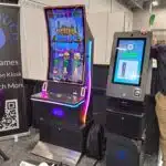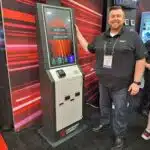 - Jeremy Dickamore displays a gaming card issuing kiosk equipped that accepts cashless payments at the Embed exhibit.