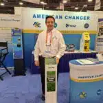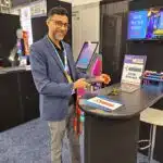 - Wayne Shihur introduces the card recycling kiosk at the American Changer Corp. exhibit.