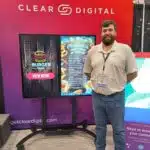 - Bruce Eisenbrown discusses interactive digital menus at the Clear Digital exhibit.