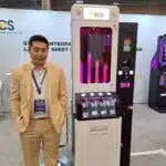 - Andy Yeh shows the Pull-Star combination redemption/lottery ticket dispensing kiosk at the ECS exhibit.