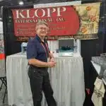 - John Oder discusses coin and currency handling equipment at the Klopp International Inc. exhibit.