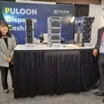 - Serene Kim and Woohyun Park demonstrate banknote dispensing equipment at the Puloon Technology Inc. exhibit.