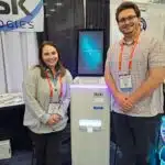 - Emily Cole and Corbin Climer show the OmniKiosk at the Innovative Kiosk Technologies exhibit.