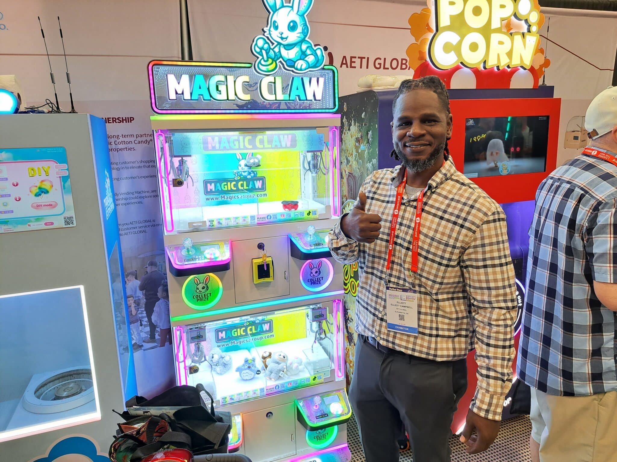 - Elliott Campbell introduces the Magic Claw Mini machine at the AETI Global Ltd. exhibit.
