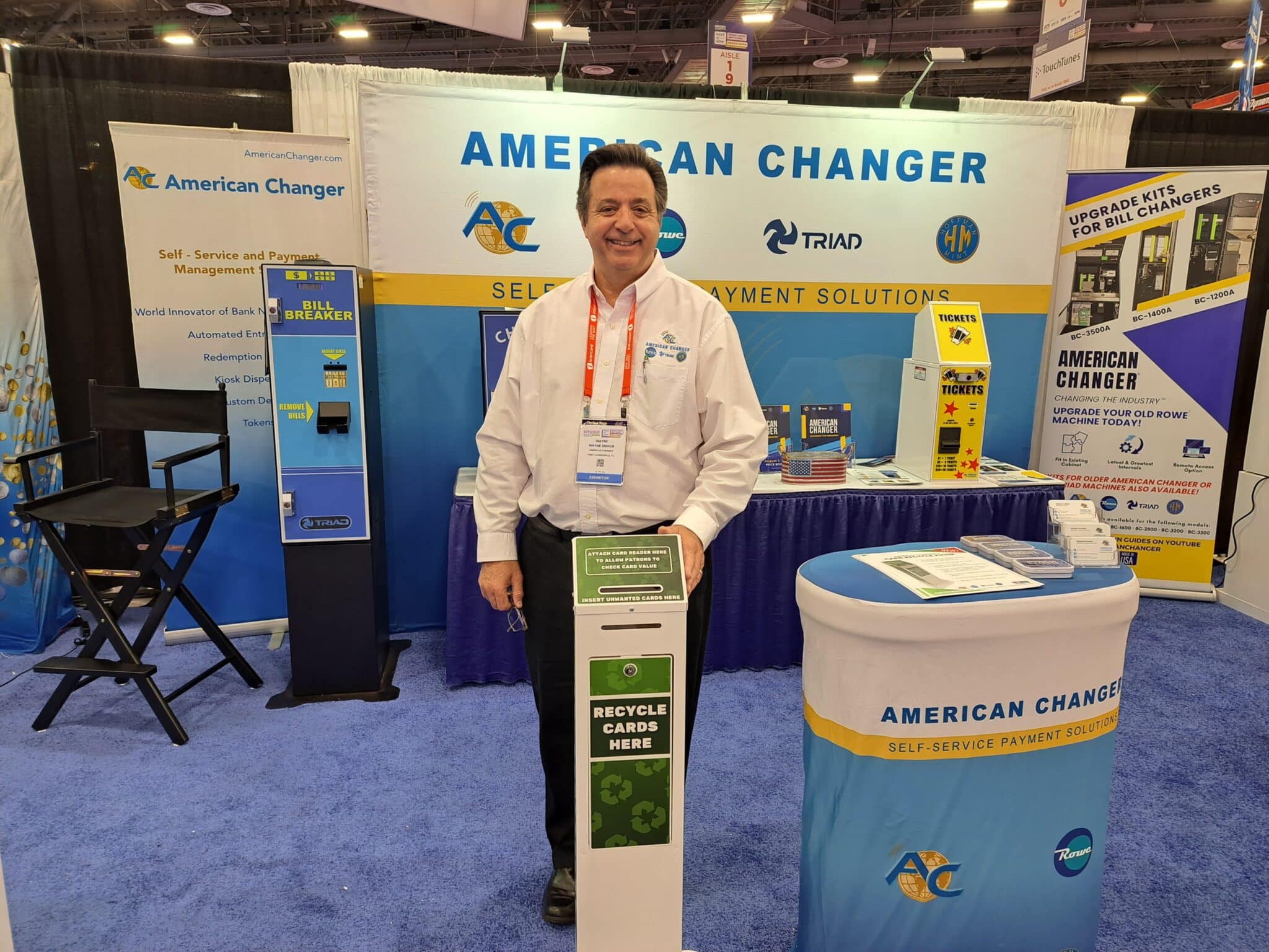 - Wayne Shihur introduces the card recycling kiosk at the American Changer Corp. exhibit.