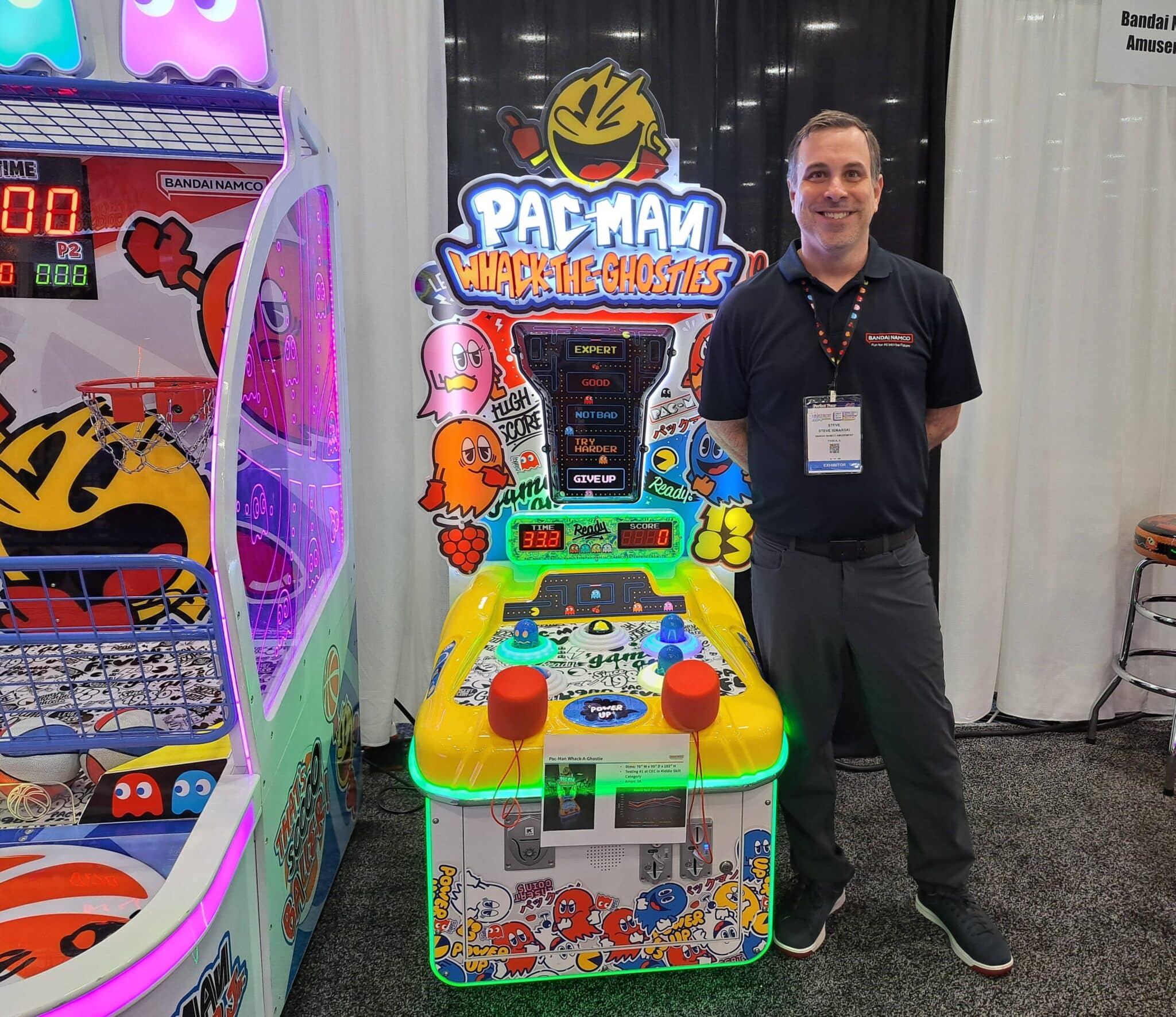 - Steve Ignarski highlights the Pac-Man Whack the Ghosties redemption game at the Bandai Namco Entertainment America Inc. exhibit.