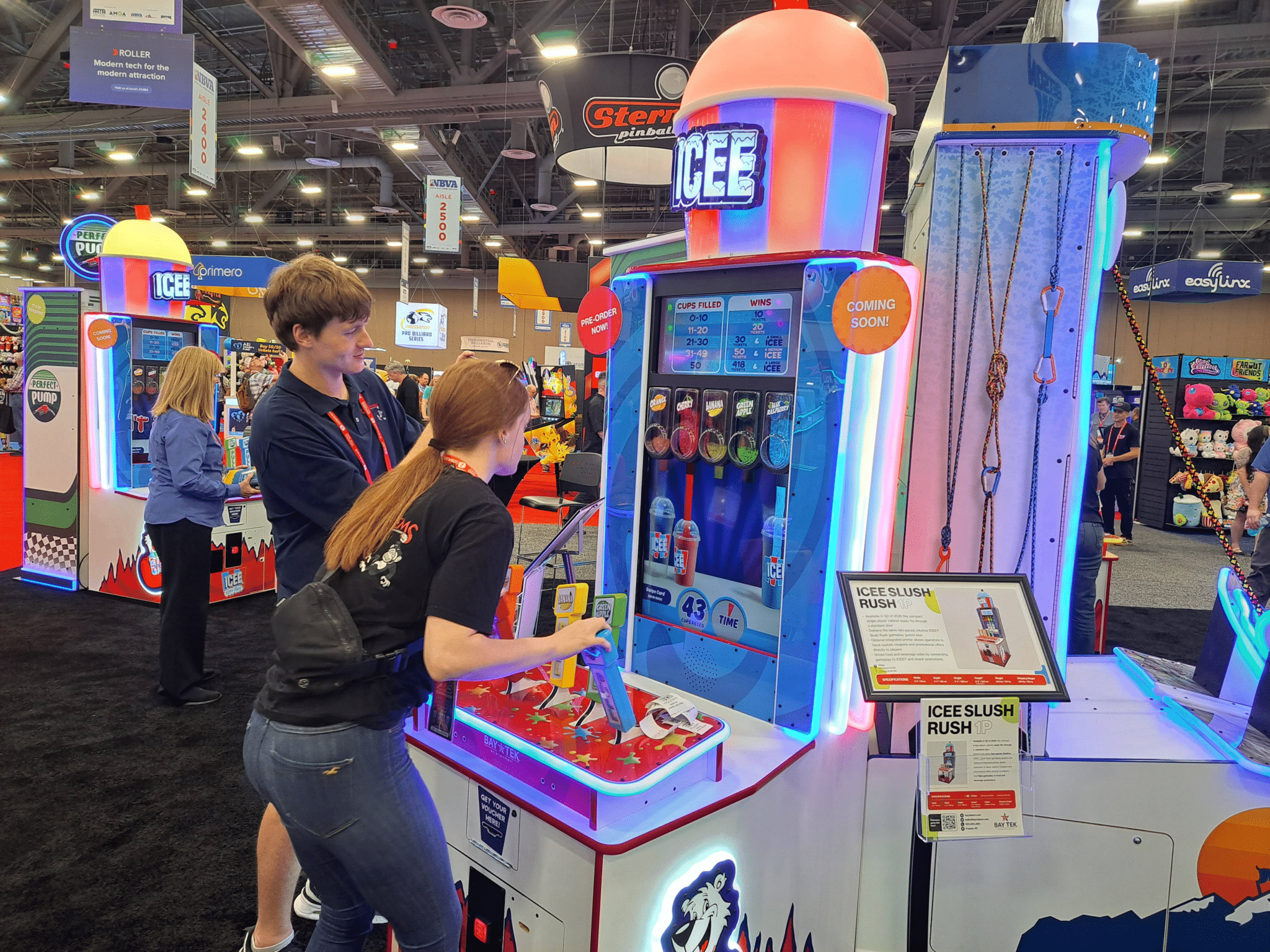 - Attendees play the ICEE redemption machine that doubles as a voucher merchandiser at the Baytek Entertainment exhibit.