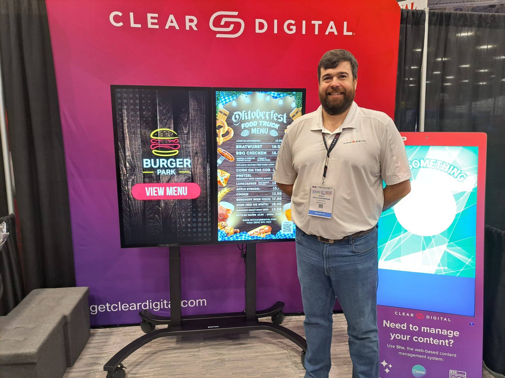 - Bruce Eisenbrown discusses interactive digital menus at the Clear Digital exhibit.