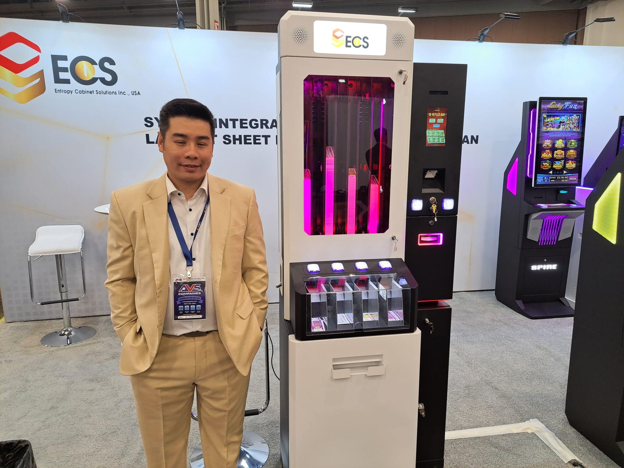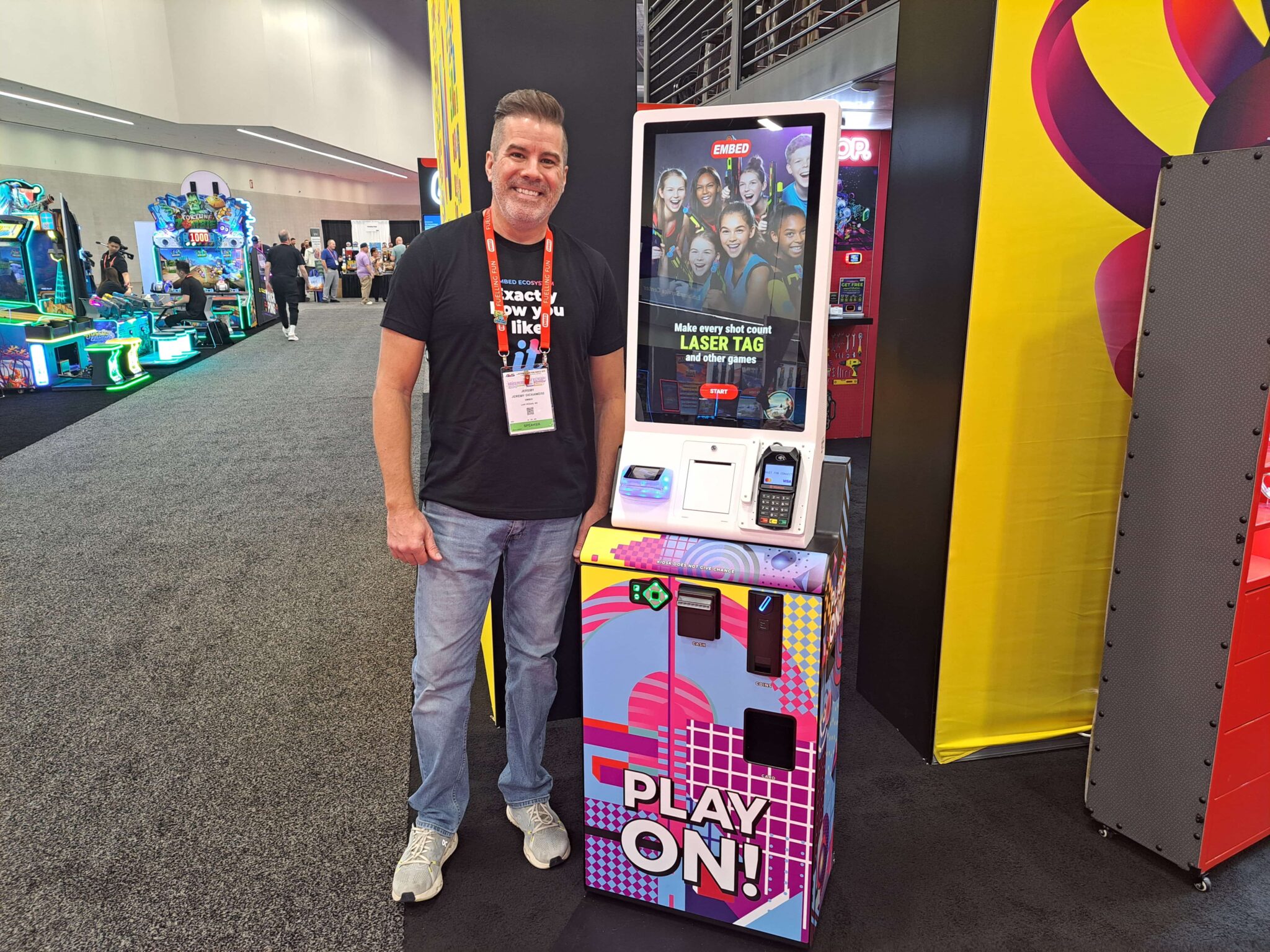 - Jeremy Dickamore displays a gaming card issuing kiosk equipped that accepts cashless payments at the Embed exhibit.