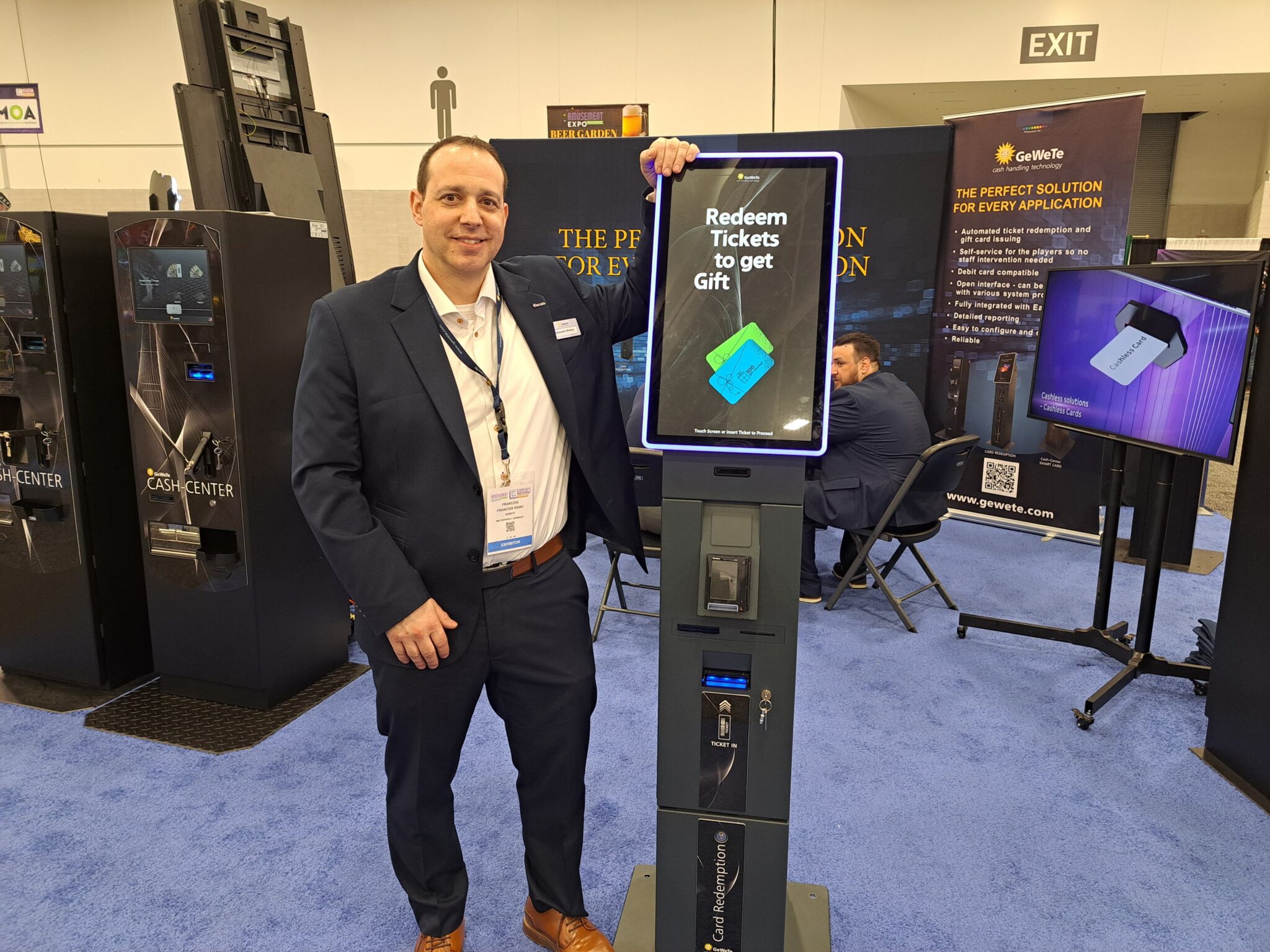 - Francois Remy presents the automated ticket redemption and gift card issuing kiosk at the GeWeTe GmbH exhibit.