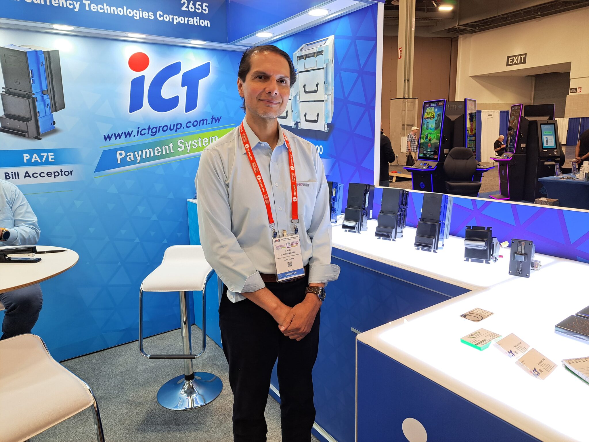 - Italo Amaral shows bill acceptors at the International Currency Technologies (ICT) exhibit.