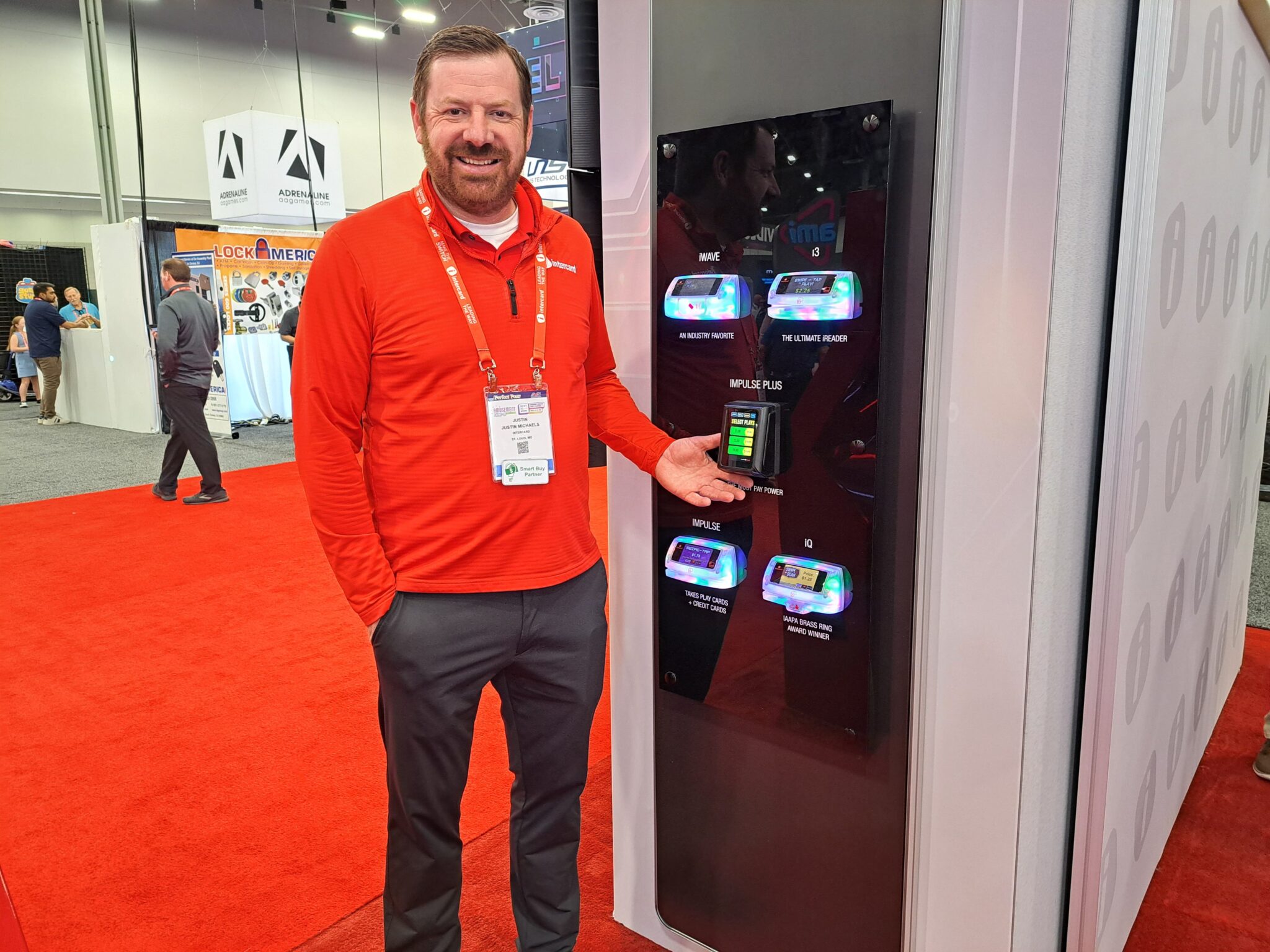 - Justin Michaels demonstrates the Impulse Plus payment reader at the Intercard exhibit.