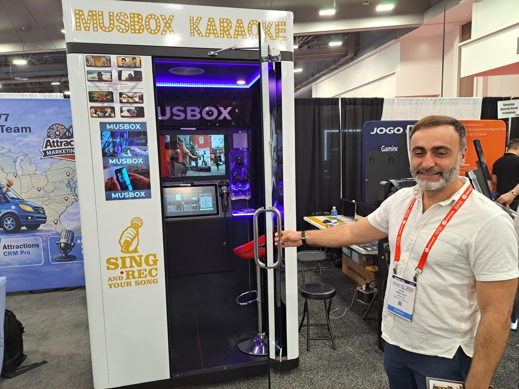 - Mark Brut invites attendees to enter the mobile karaoke kiosk at the Musbox exhibit.
