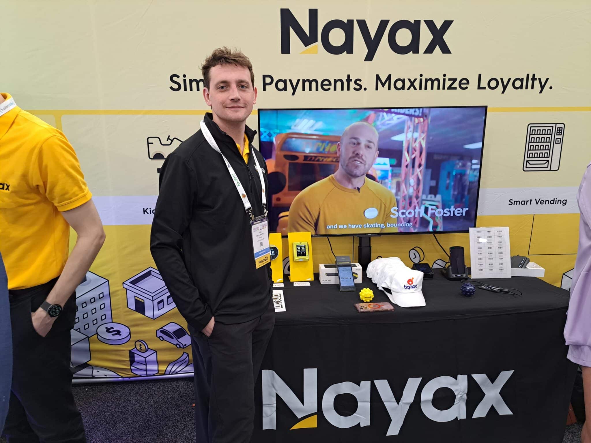 - Paul Drutch highlights the VPOS reader at the Nayax Ltd. exhibit.