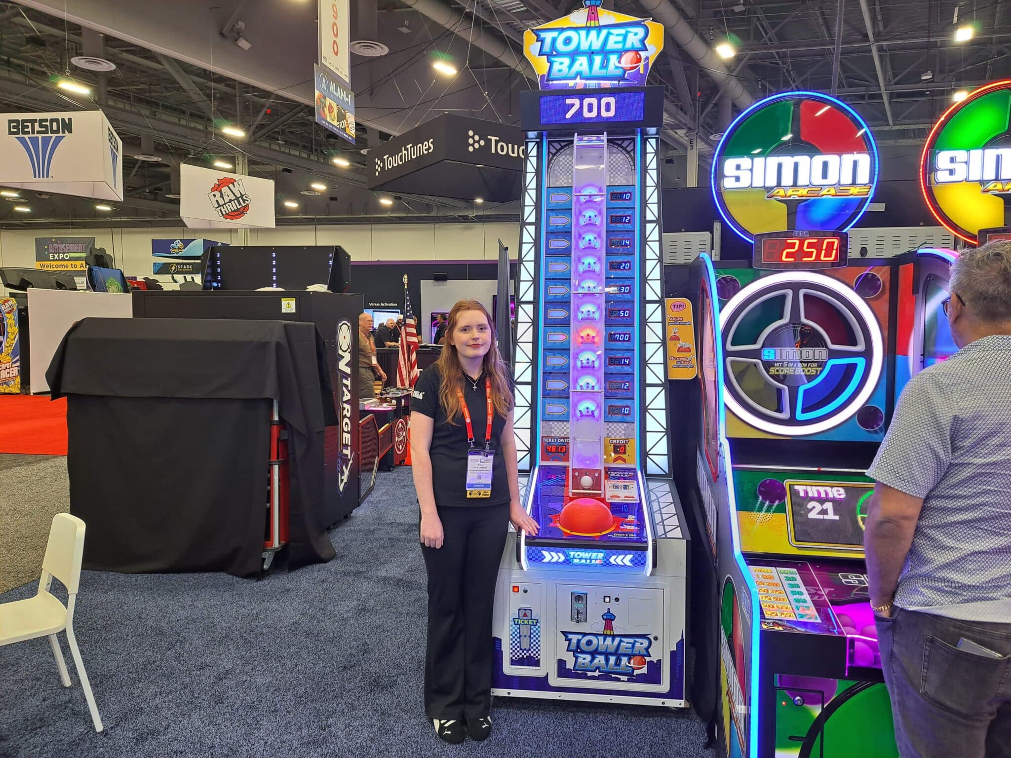 - Ryla Lambert invites attendees to play the Tower Ball game at the Sega Amusements International exhibit.
