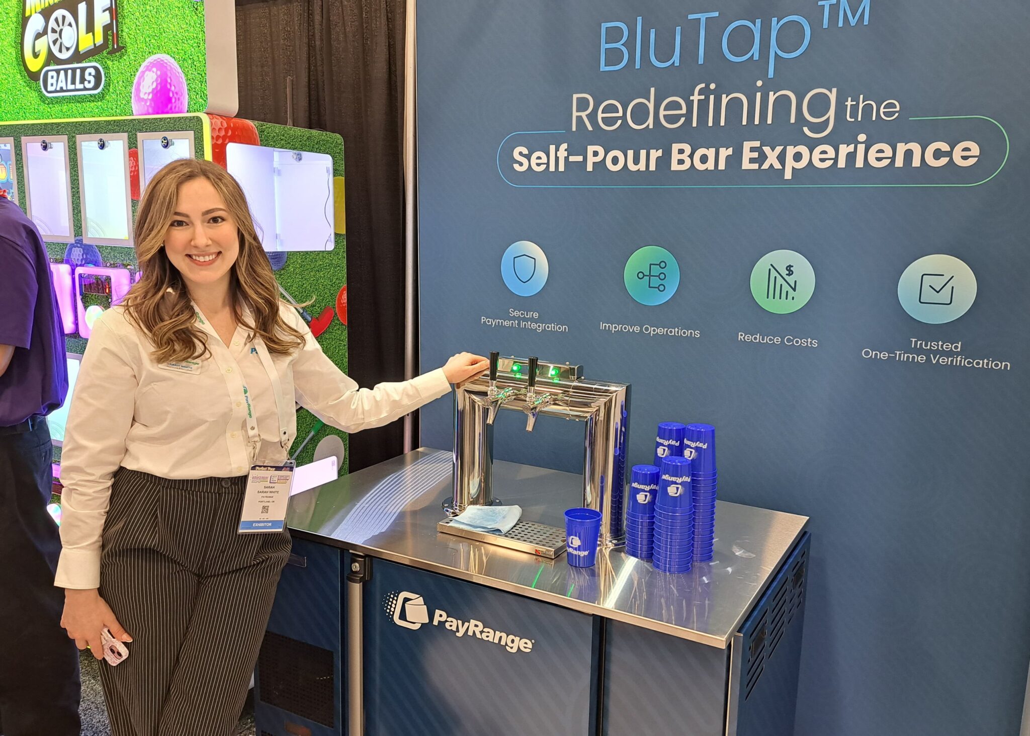 - Sarah White shows the BluTap self-pour technology at the PayRange LLC exhibit.