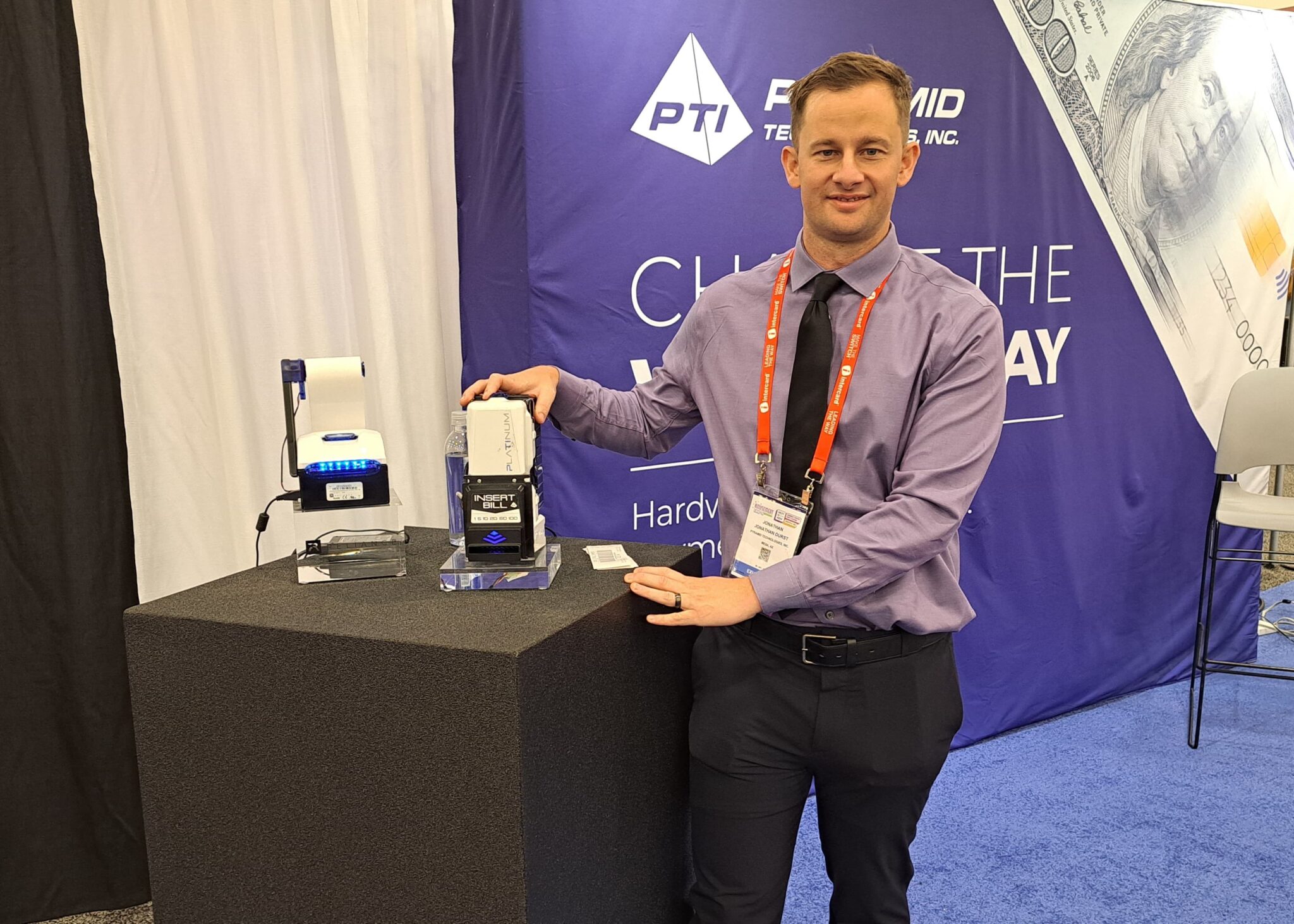 - Jonathan Durst highlights the Platinum bill acceptor at the Pyramid Technologies Inc. exhibit.