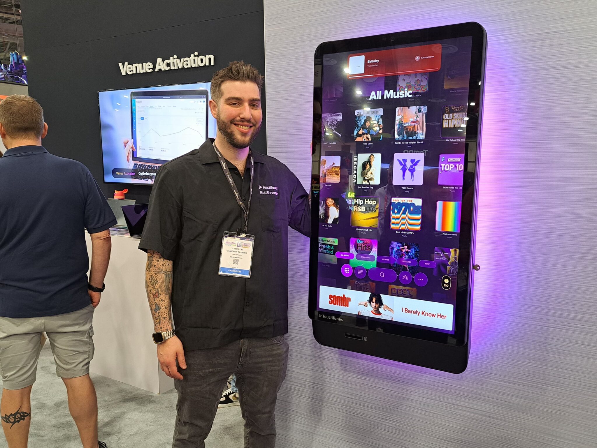 - Cameron Fleming introduces the new, still-to-be named, flagship jukebox at the TouchTunes exhibit.