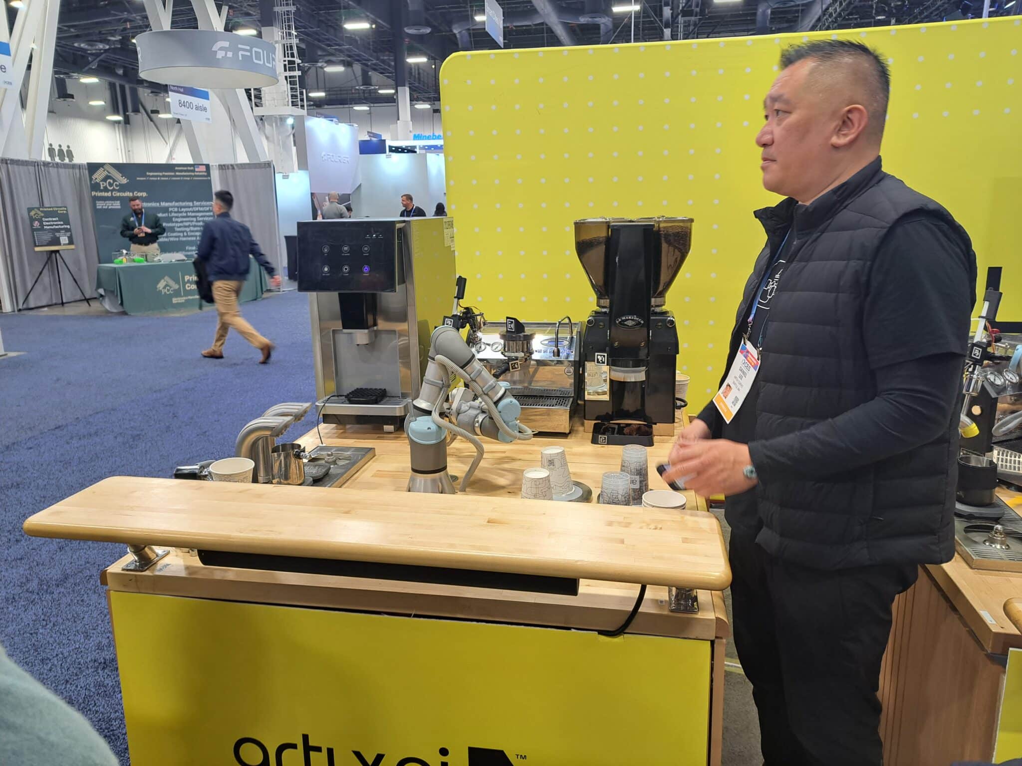 - Daniel Lee presents the Barista Bot at the Artly AI exhibit.