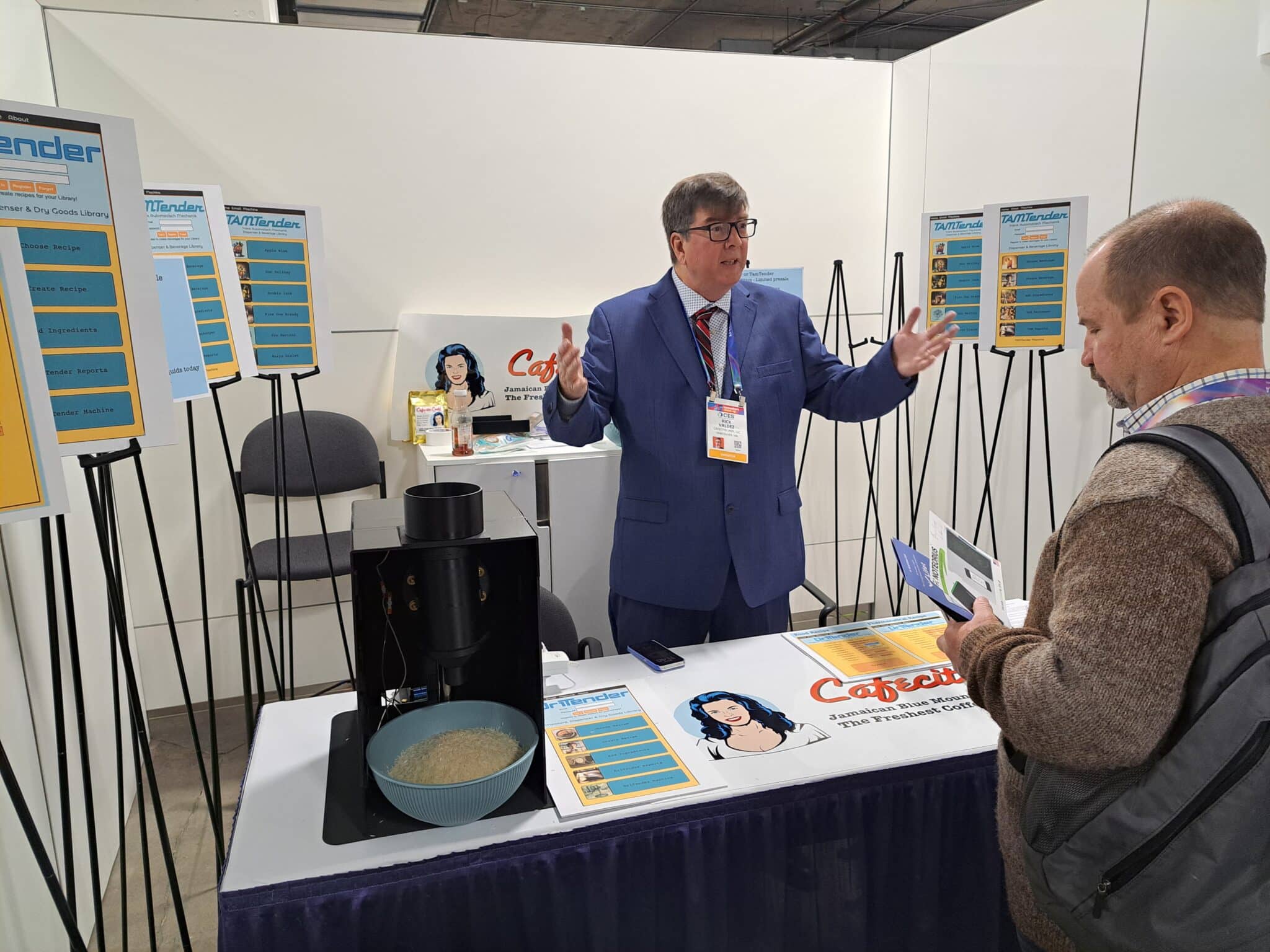 - Rick Valdez introduces a prototype for the DriTender dispensing platform at the Cafecito Lady LLC exhibit.