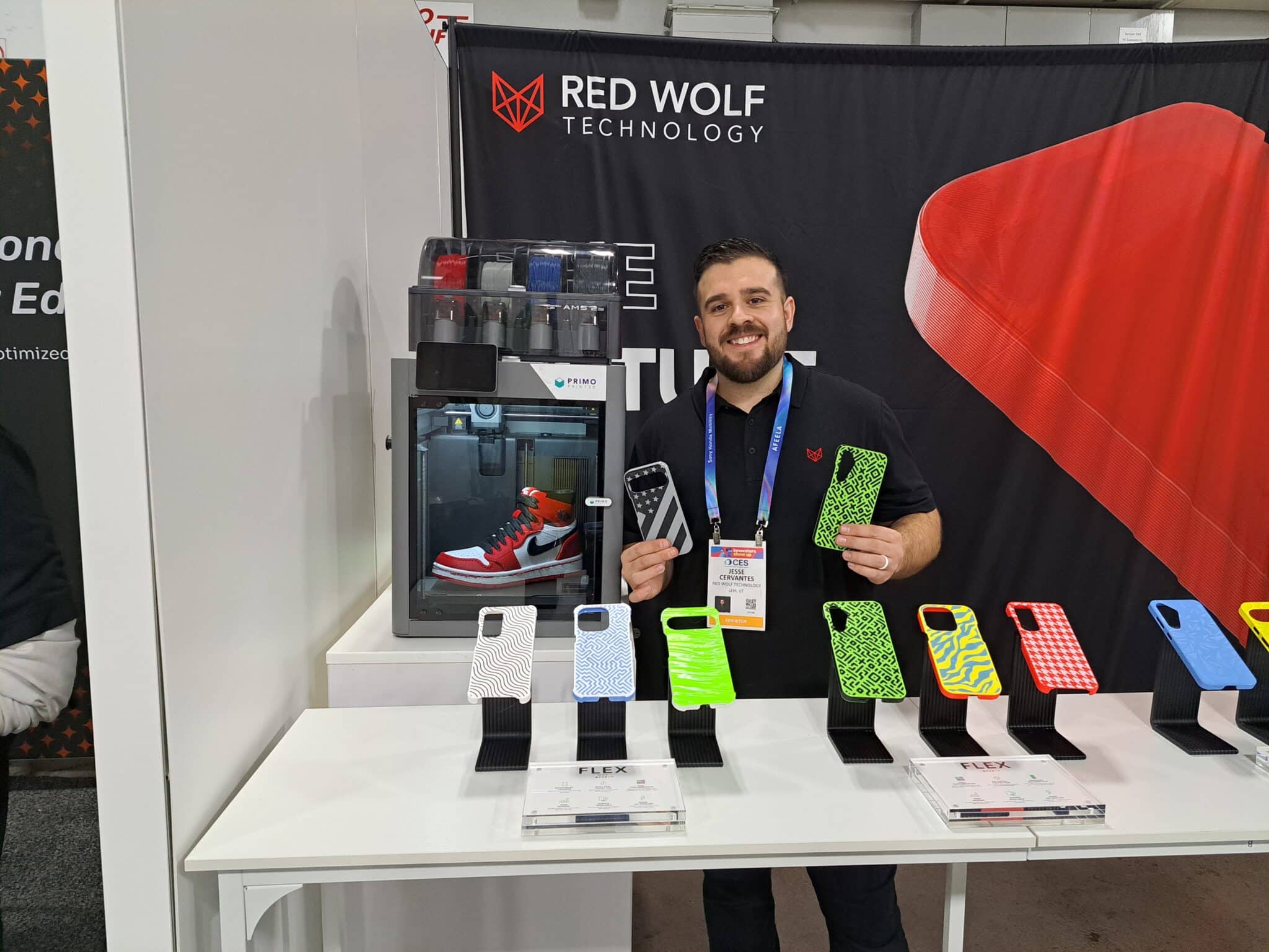 - Jessie Cervantes presents phone cases from a 3D printing machine at the Red Wolf Technology exhibit.