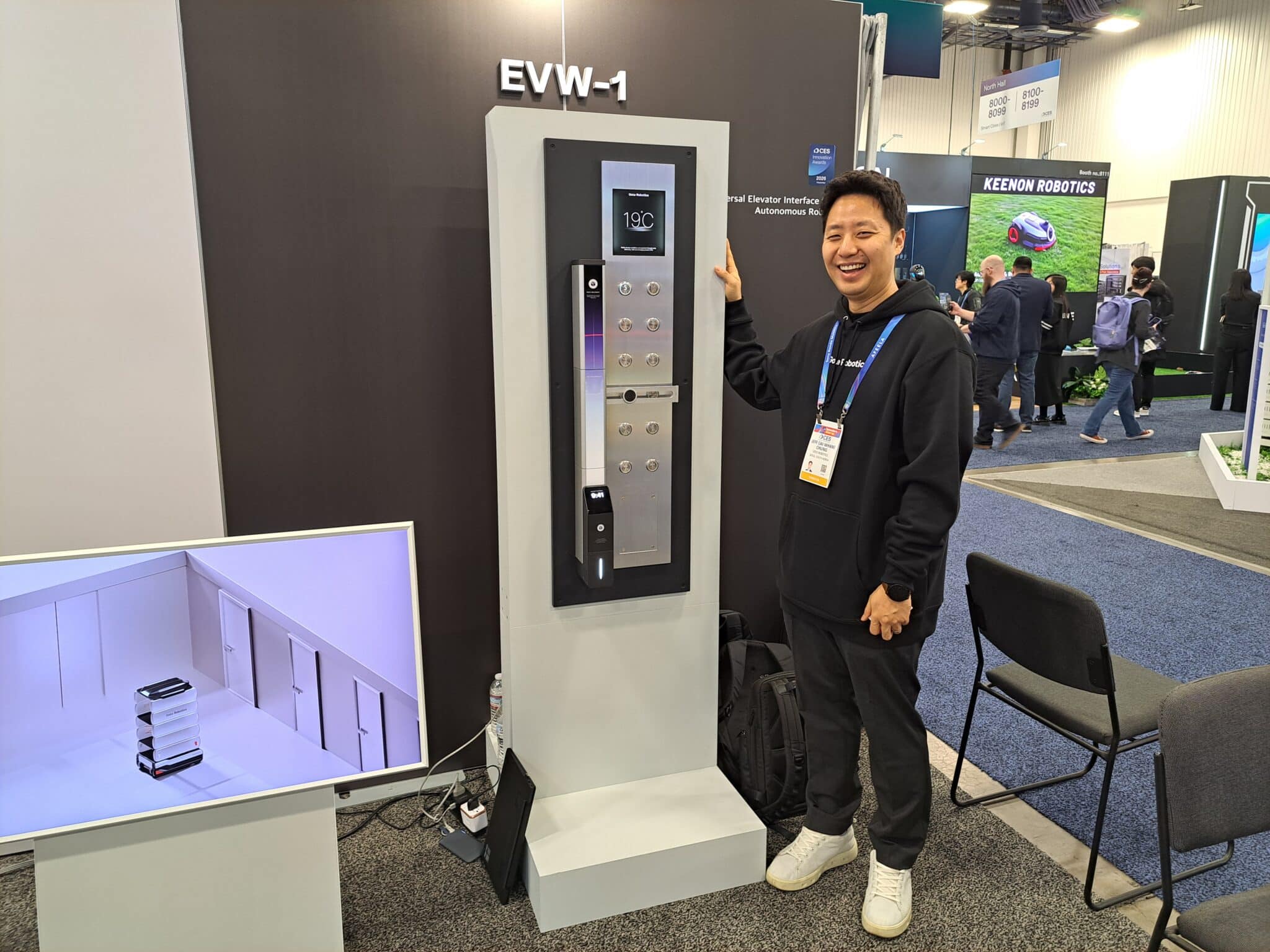 - Jeff Chung presents a prototype of the AA-2 autonomous delivery robot at the Gole Robotics exhibit.