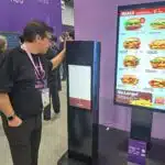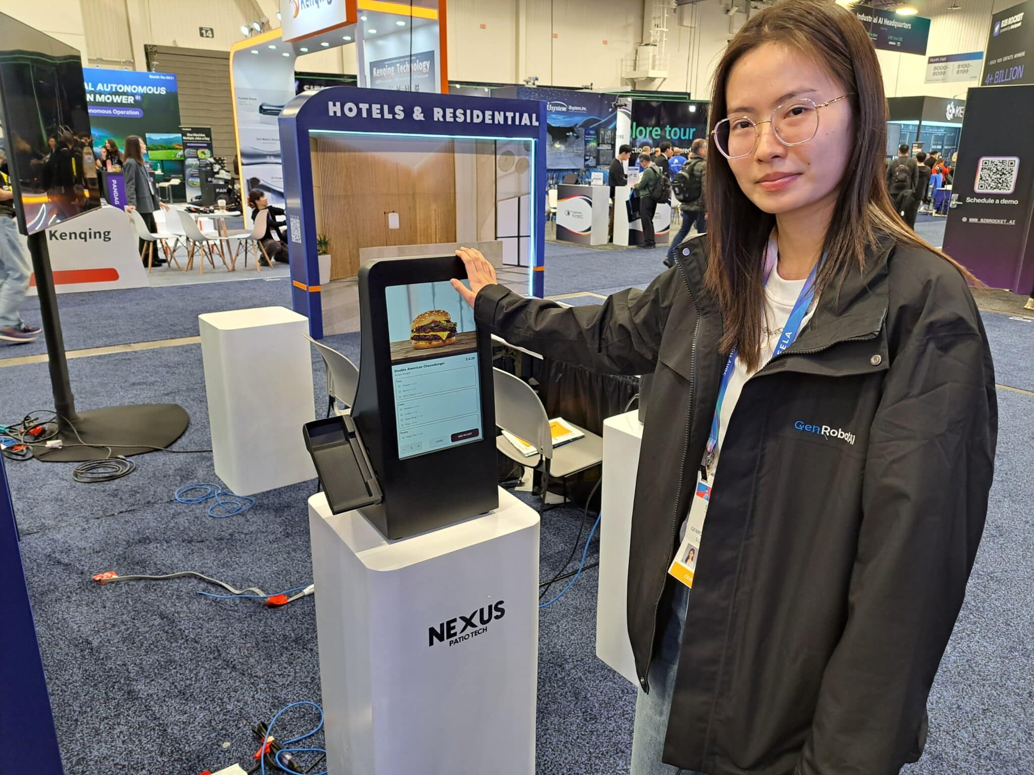 - Shihan Liu of Genrobot explores the burger order kiosk at the Nexus Patio Tech exhibit.
