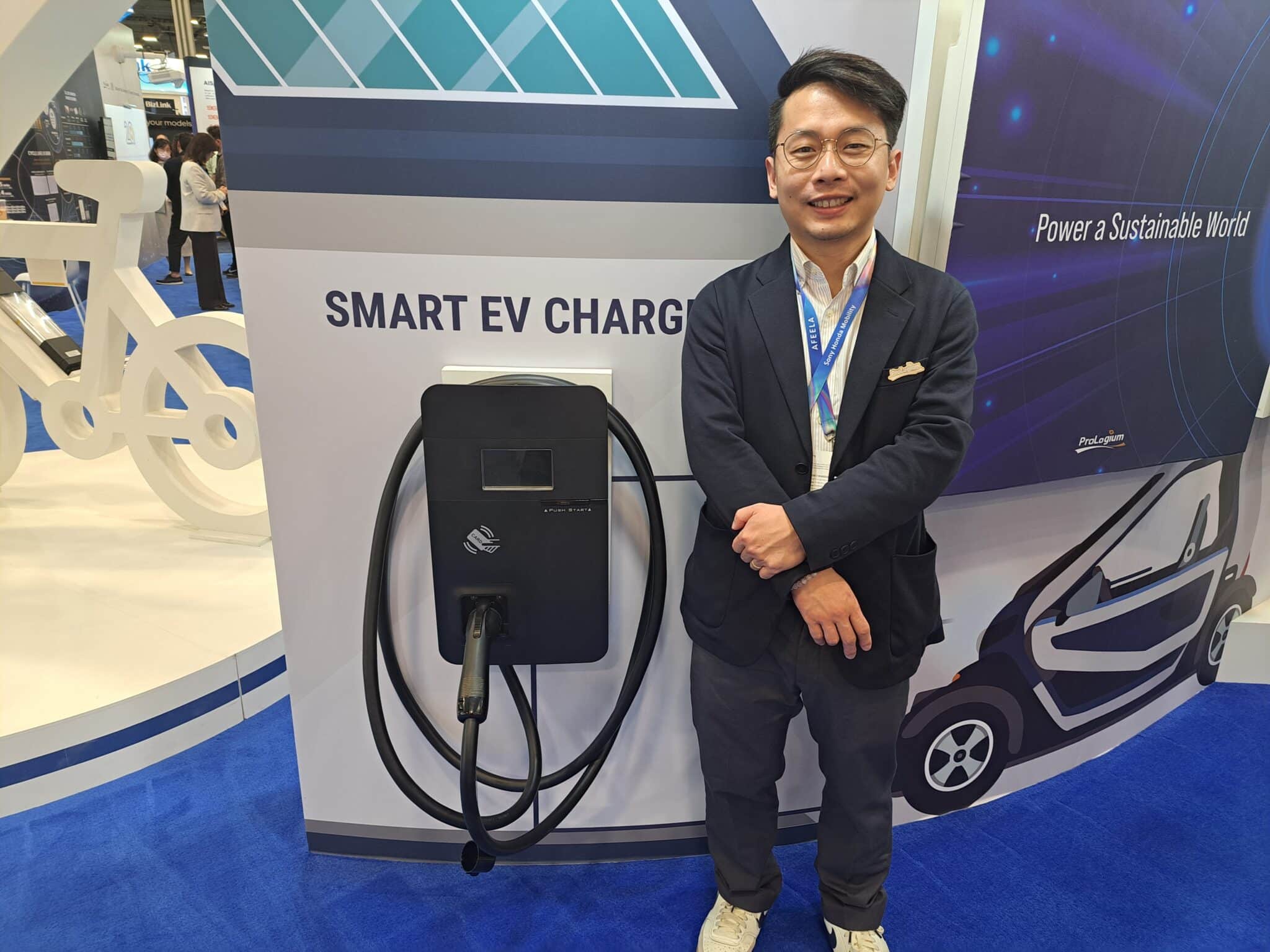 - Cheston Cheung presents an EV charging battery module at the Prologium exhibit.