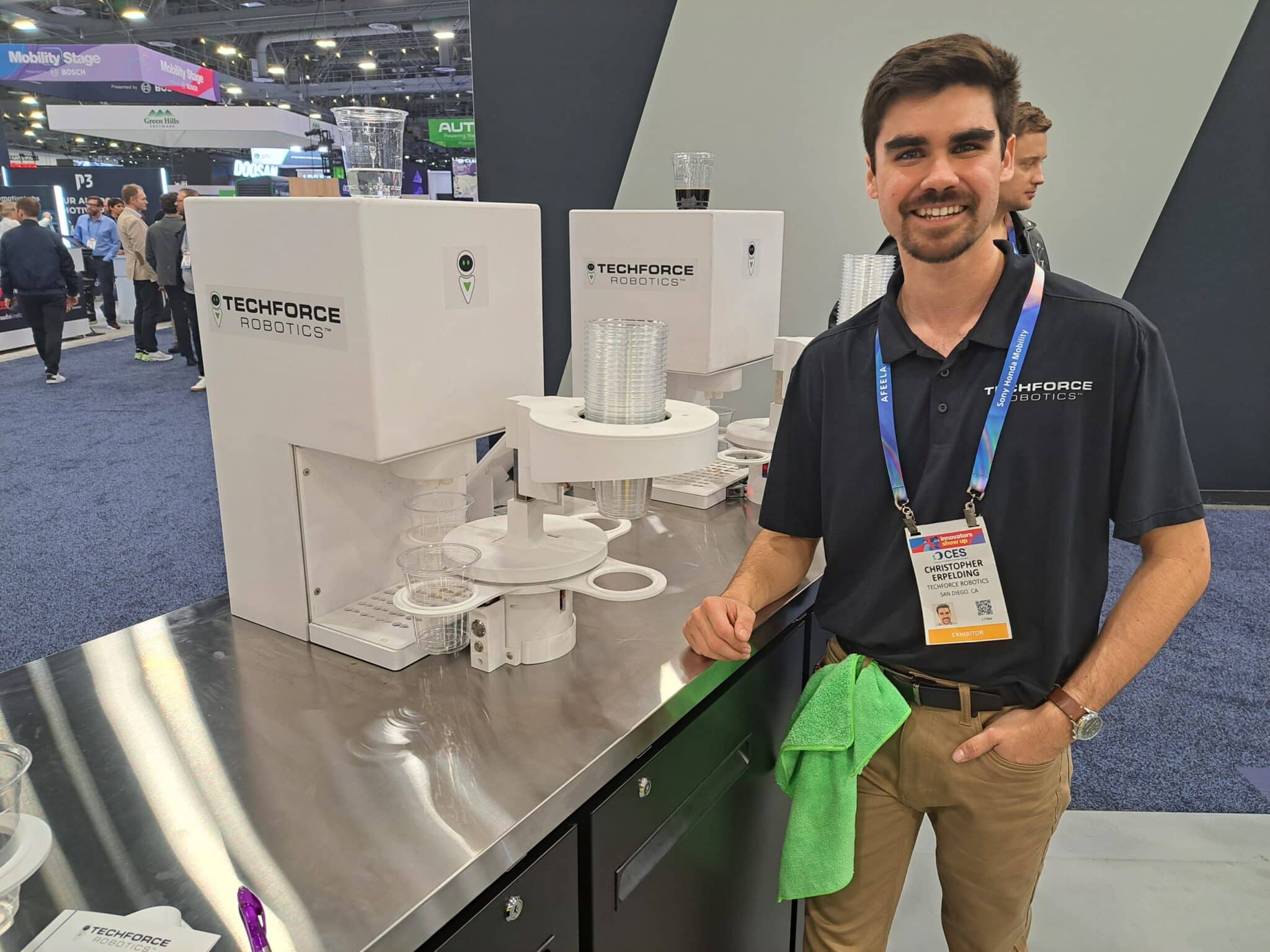 - Christopher Erpelding presents the Beverage Bot machine at the TechForce Robotics exhibit.