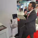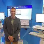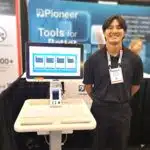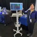 - Kenneth Yoo shows the Vantage Vitals cart at the Pioneer Solution exhibit.
