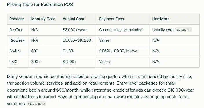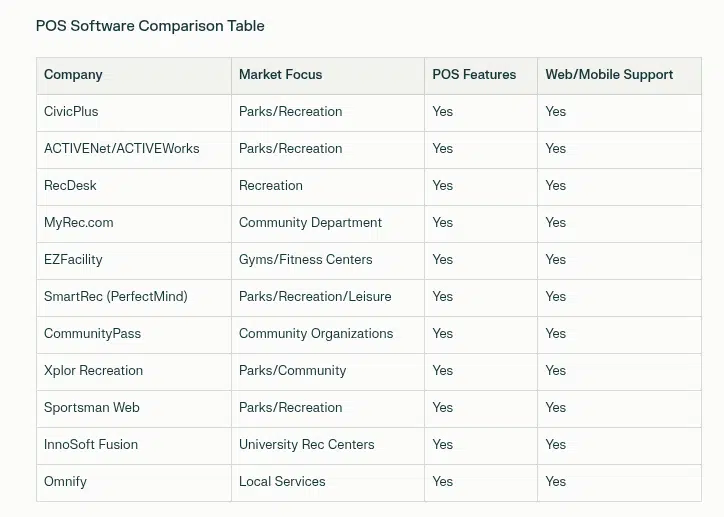 Univerus, ePACT, Jarvis, Parafait, DaySmart Recreation, RezExpert, DSE Rec Center, CampDoc: Regional or niche providers with POS and recreation management offerings.