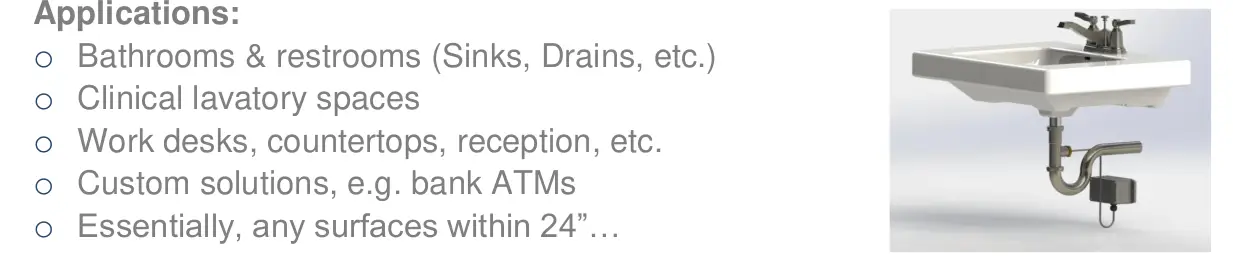 We mentioned the sinks. Here is a UV implementation for sinks (and all kinds of objects). The neat thing about this technology is that it actually supports built-in active data monitoring. Sinks are greater source of airborne “germ aerosol” as the current user turns on the water and it displaces the air which was trapped from previous user and pumps it into the air. Learn something everyday