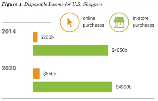Consumers look to spend in brick-and-mortar When discussing the state of retail, it is important to investigate retail spending trends. Recent research by eMarketer takes a look at how and where consumers in the United States are going to be spending money over the next 6 or 7 years. eMarketer’s research reveals that disposable income spent by consumers in the U.S. for brick-and-mortar retail stores will be $5 trillion by 2020 (Figure 1).